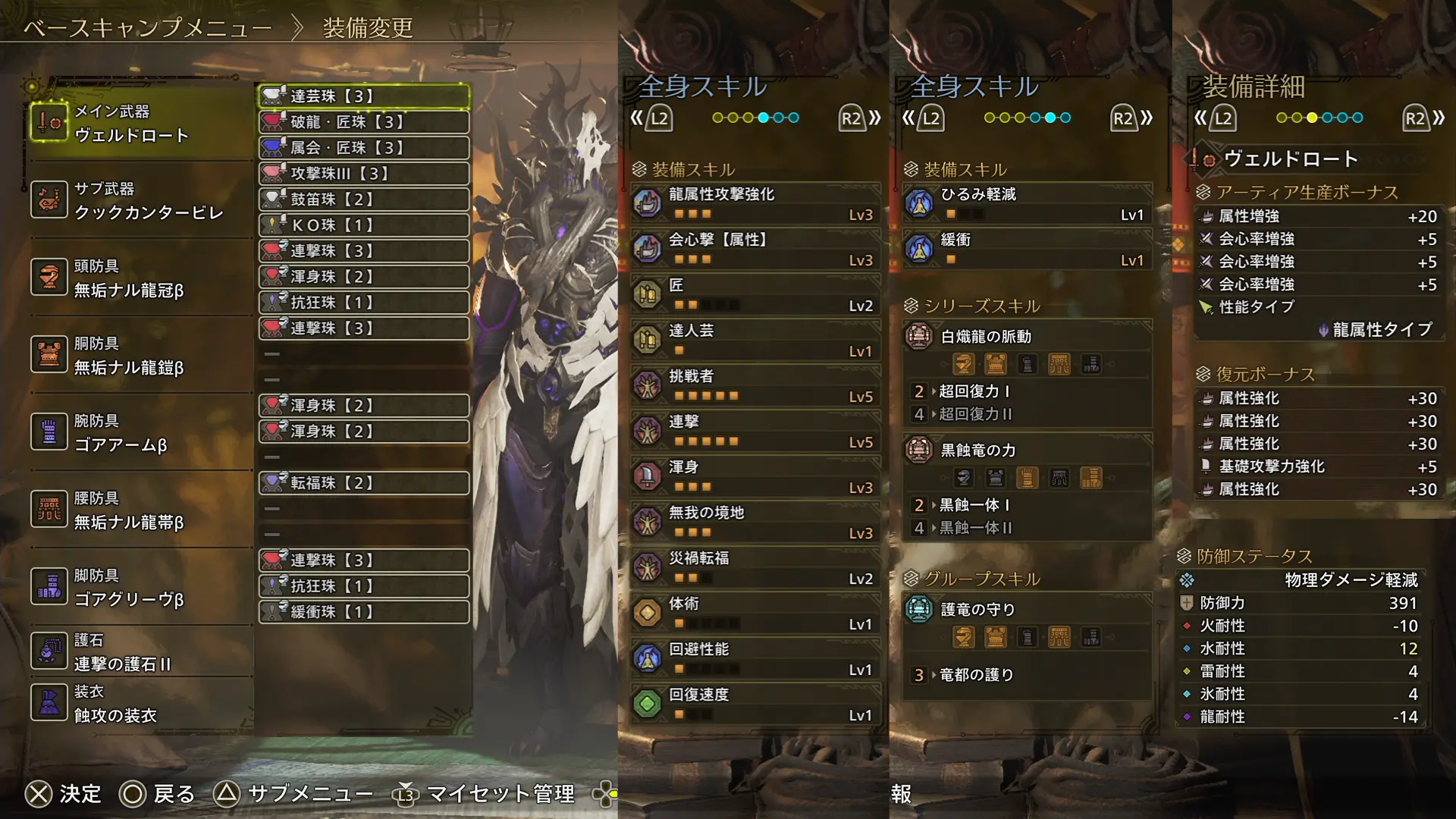 挑戦者Lv5 / 連撃Lv5 / 渾身Lv3 / 無我の境地Lv3 / 災禍転福Lv2 / 体術Lv1 / 回避性能Lv1 / 回復速度Lv1 / ひるみ軽減Lv1 / 緩衝Lv1 / 超回復力Ⅰ / 黒触一体Ⅰ / 竜都の護り /